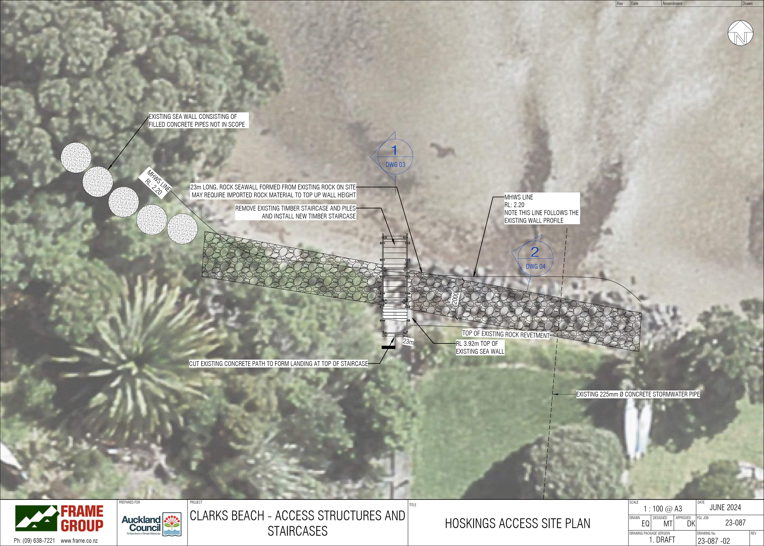 Frame Group was engaged by Auckland Council to assess and redesign access structures and informal coastal protection features at Clarks Beach, where aging timber steps and ad-hoc bank stabilisation works were no longer fit for purpose. Working collaboratively with the council’s coastal team, we developed upgraded access solutions and bank protection using durable materials and sustainable design strategies.